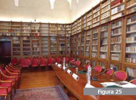 The Negri da Oleggio Room (fig. 25) is located between the Rectorate and the Aula Magna (Lecture Theatre), next to the Doric Cloister, and overlooks the Garden of St. Catherine, traditionally known as the Garden of the Virgins. It takes its name from Count Vincenzo Negri da Oleggio (1887-1976), a great scholar and bibliophilist from last century. In 1968, he donated the precious book collection housed in this room to the University.