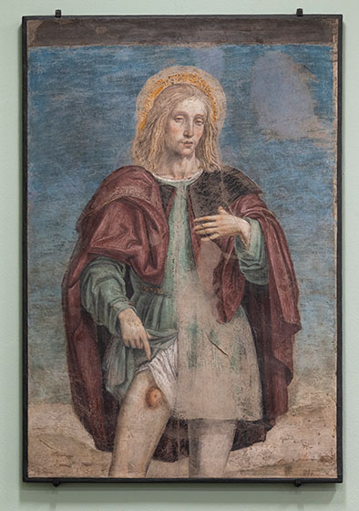 Le Sante vergini e martiri e il San Rocco decoravano a gruppi di tre le nicchie del transetto della chiesa milanese di S. Maria presso S. Satiro, una delle creazioni architettoniche più emblematiche di Donato Bramante, con cui esse erano chiamate a dialogare. Sono opera dei fratelli Ambrogio e Bernardino da Fossano, detti Bergognone, artisti di punta dell’età sforzesca, celebri per il loro importante contributo alla decorazione pittorica della Certosa di Pavia.
