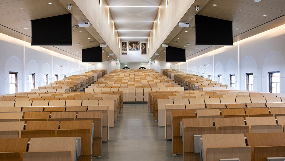 The frescoes come from the Augustinian convent of Santa Marta where they adorned the outer wall of the church, intended for the congregation and separated from the area used by the nuns. Other paintings from the same convent are on display in the Lecturers’ Room and on the Veranda of the Aula Magna. The two sisters saints, Martha and Mary Magdalene, depicted with their usual attributes (respectively a bucket and a sprinkler, with which Martha managed to tame the dragon crouching at her feet, and the jar of ointments with which Mary Magdalene anointed Christ’s feet), flanked the jambs of the entrance portal, peering out from quadrangular niches only partially preserved after being detached. The three golden-haired angelic musicians, instead, surmounted the portal itself, sheltered by a green velvet canopy, of which only the uppermost portion remains.