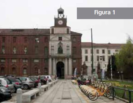 Regular, designed with a double architectural order with pointed arches flanked by pilasters alternated with windows, the new building is entirely covered with exposed bricks: a choice dictated by the proximity of the Ambrosian Basilica, by the will to differentiate the new intervention from 16th century plasters and also by the great cohesion between the bricks themselves and the reinforced concrete used for the framework of the building. Inside the building, in contrast to the rigour of the weaving of the cotto tiles, the big entrance gate (fig. 1) is in white granite, unsymmetrical in comparison with the rest of the building, but aligned with the axis of the inner Doric Cloister, to which it is connected by an open brick colonnade, the so-called telescopic perspective.
