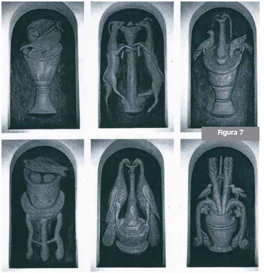 The isolation and the frontal position of the figures recalled Byzantine models. Above the works mentioned, there are six bas-reliefs (fig. 7) portraying: the Agnus Dei, female deer, doves, peacocks drinking from the spring of Life, bread and fish, and finally the source of Life itself, from which come out sheaves of wheat and vine shoots, on which two doves are resting. Once again, the reference to Paleochristian art and its symbology is crystal clear.