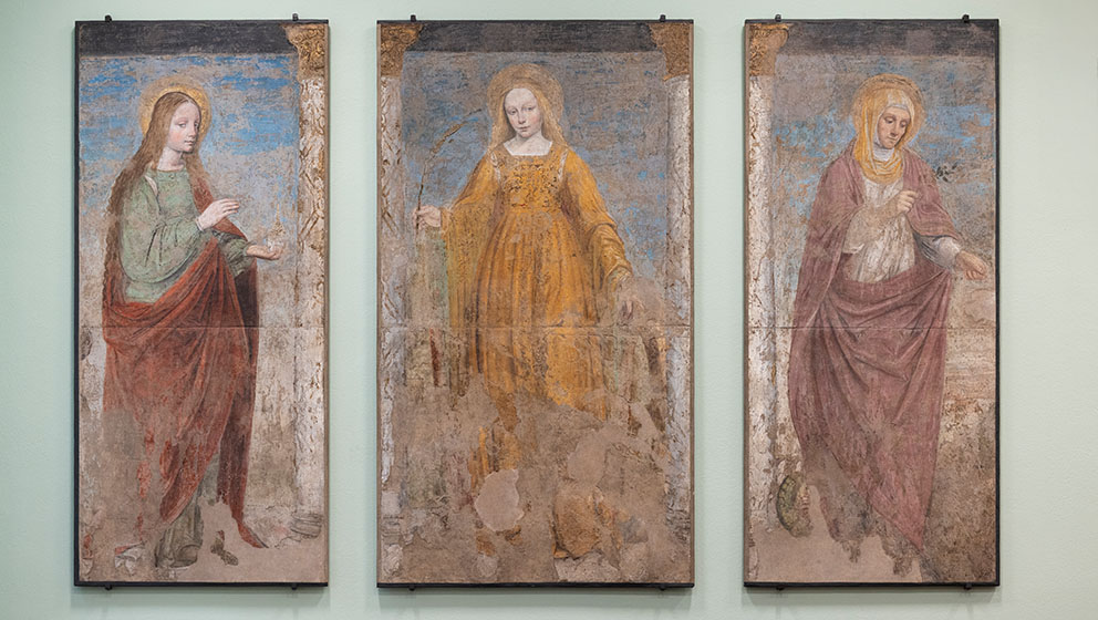 The Holy Virgins and Martyrs and Saint Roch originally adorned, in groups of three, the niches of the transept in the Milanese church of Santa Maria presso San Satiro - one of Donato Bramante’s most iconic architectural creations - with which they were intended to engage in dialogue. They are the work of the brothers Ambrogio and Bernardino da Fossano, known as Bergognone, leading artists of the Sforza era, famous for their significant contribution to the pictorial decoration of the Certosa di Pavia.