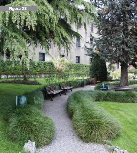 In its present arrangement, the garden appears to be a fragment of the “Viridario Magno”, a typical late Medieval garden, popular especially in Northern Italy. Its rather simple design was characterized by orthogonal lines, interspersed by changes in surface, banquettes and fences. The paths were made of different materials, such as stone, bricks and polychrome tiles. The garden, on the other hand, was made of clay court, fine gravel and grass patches, where it was possible to pause for rest. In spite of the absence of a geometrical centre, in the green and flowering areas of the “Viridario Magno”, you could breathe an increasingly intimate and exclusive atmosphere.
